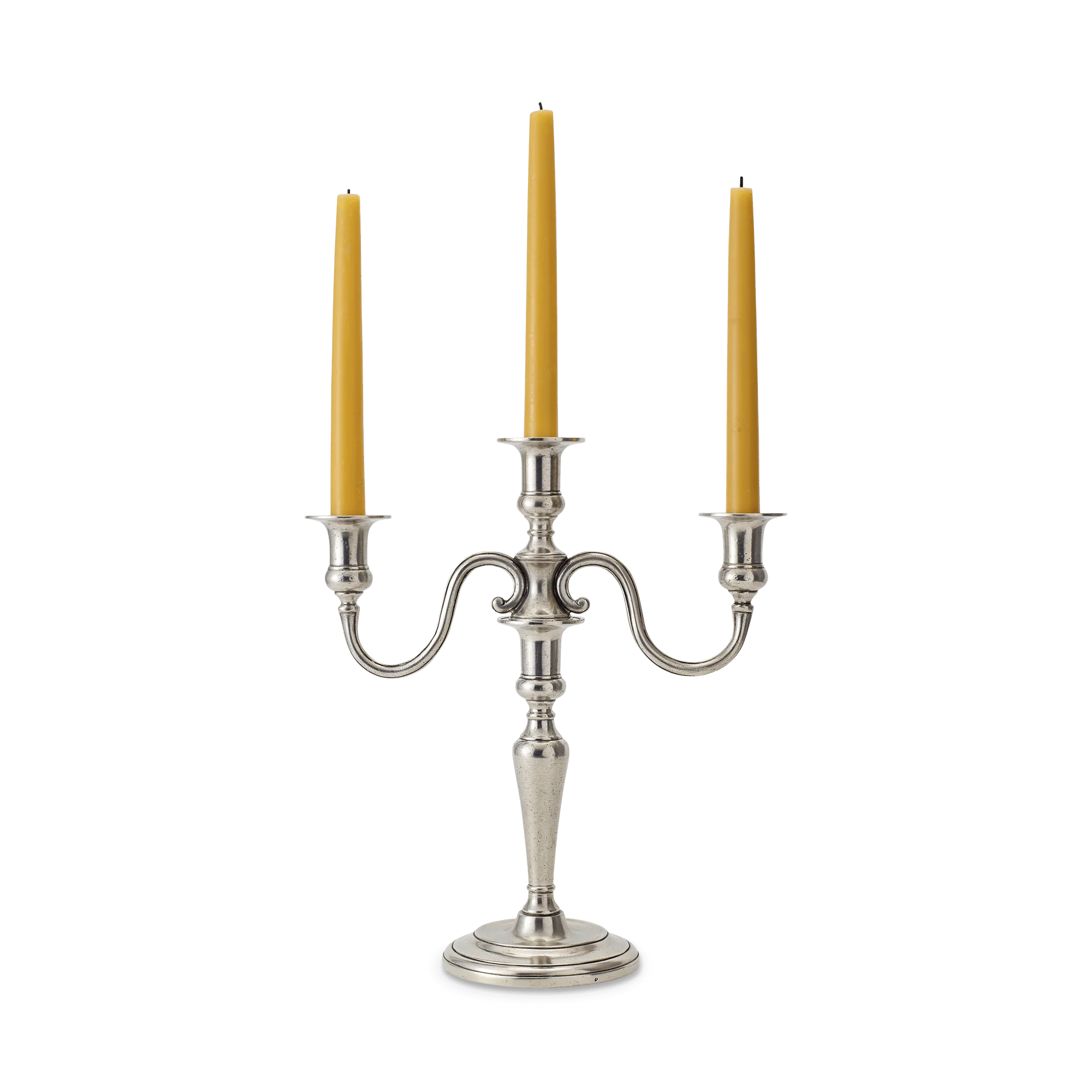 Our all-pewter 3 flame candelabra provides bright, elevated illumination and classical elegance for any setting. A sure way to let your guests know they are part of a very special gathering. Additional arms can be added to this piece for a truly stunning display. *Please note, the candelabra arms are bent inward for safe packing and shipping. Once received, place the arms on the candelabrastick, and pull each arm out to the desired position.